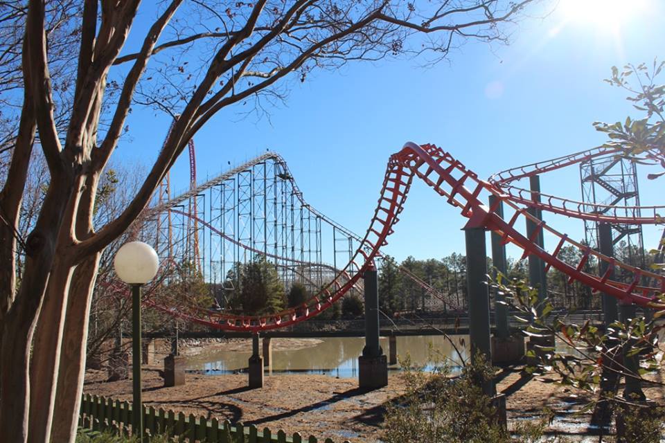 A fresh paint job for the Anaconda! During the off-season, we’ll be sprucing up the look of the Anaconda roller coaster by repainting the entire ride. The lake below the ride is already drained and work is underway to have the ride ready for the 2014 operating season. And the colors? Well, the ride columns will be green, the supports for the track red and the train’s running rails yellow.