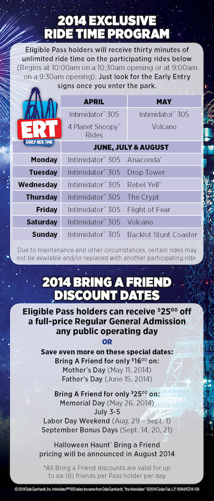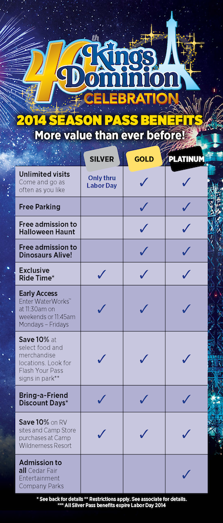 Season pass benefits have been very basic these past couple years. Early entry to the back of the park and Waterworks, bring-a-friend discounts, and a few others. However this season, Kings Dominion will be giving us season pass holders a bit more for our money. See the list below for details.