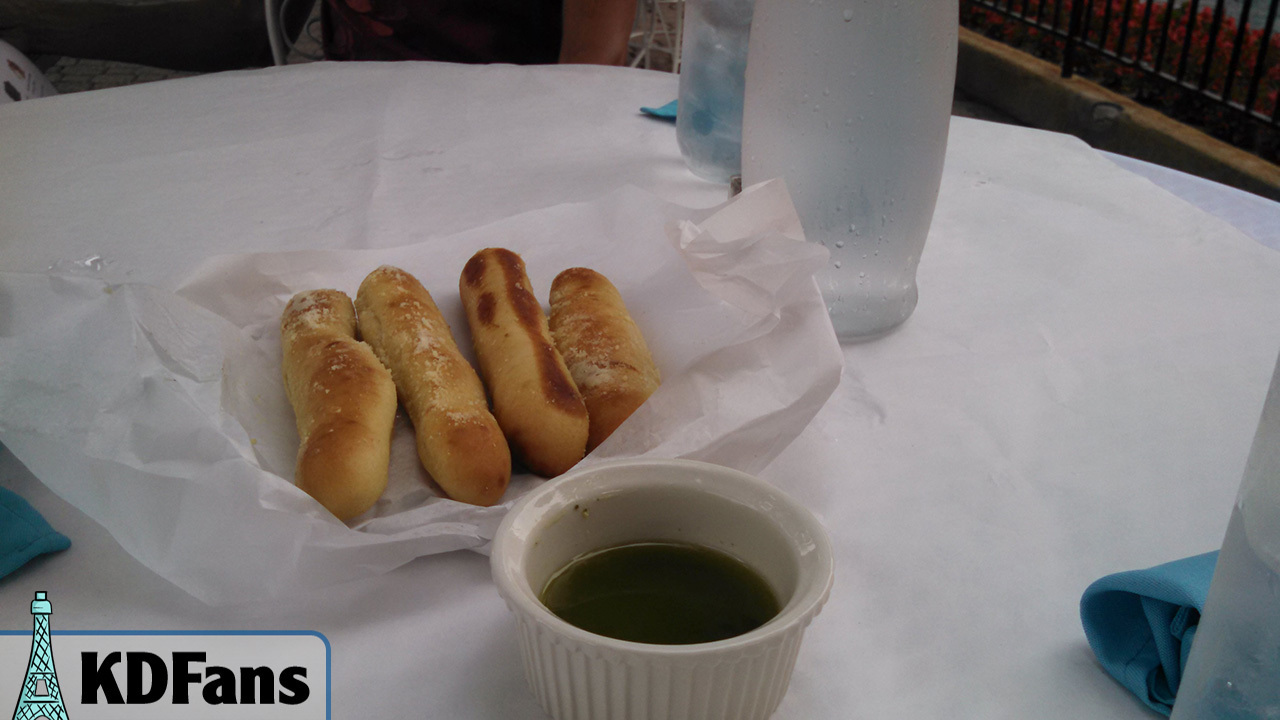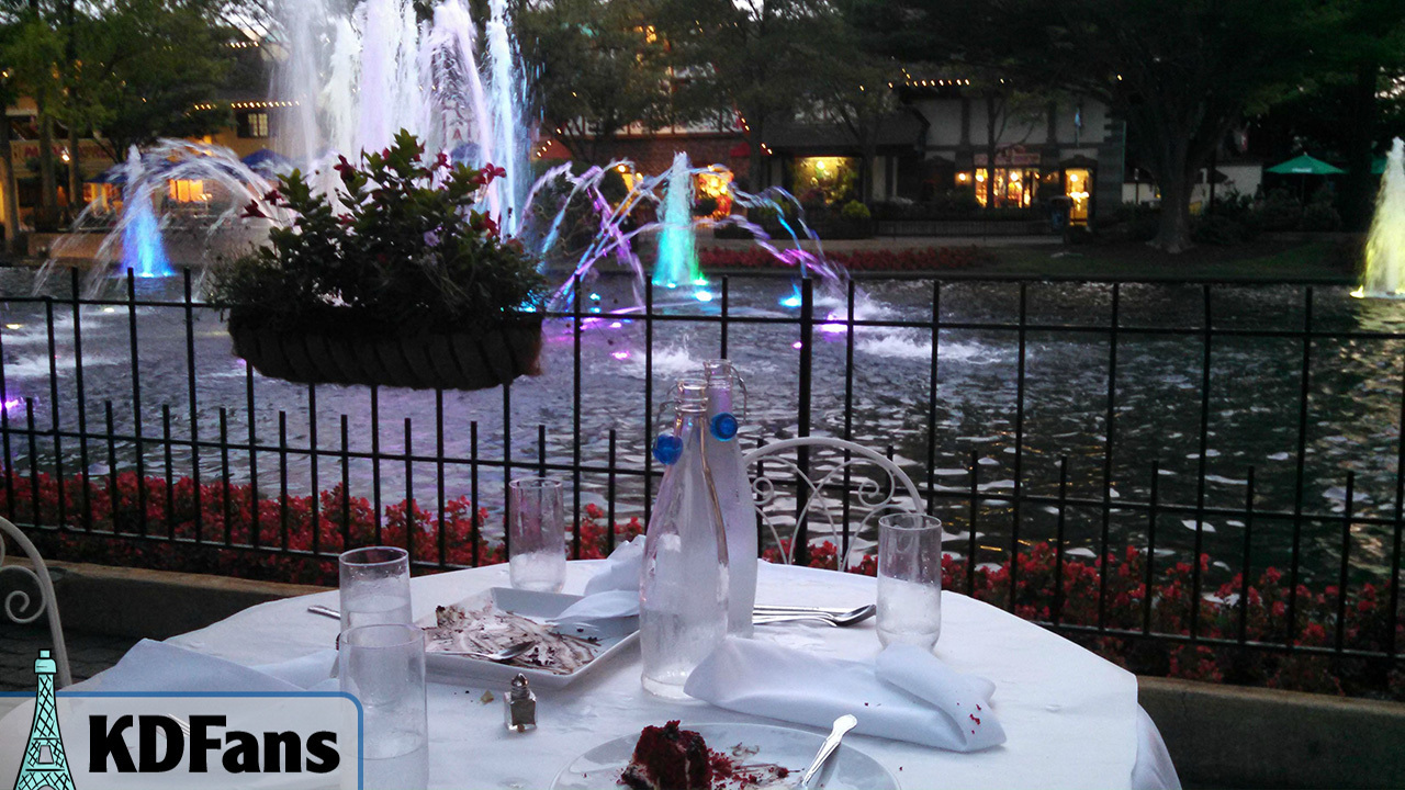 Let me start off by saying the whole atmosphere of the place was superb. The beautiful International Street fountains splashed to one side, and the whole place was secluded in the landscaping of the area. There was also a great view of the nearby clock tower and the rest of the European buildings in the area. We were serenaded with the beautiful music playing throughout the village, and simply sat back and relaxed throughout the meal. To say it was pleasant was an understatement.