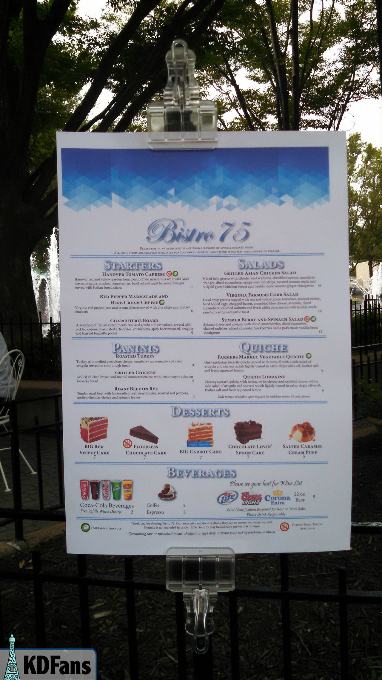 A surprising new dining experience appeared on International Street this Thursday called Bistro 75. Nestled in a cove of planters across from the Emporium, Bistro 75 is an all-new full-service restaurant located along the International Street fountains. The restaurant offers a variety of fresh-cooked gourmet foods, wines, and desserts. Going along with the European theme of International Street, the menu features foods with a heavy European influence and a level of fancy that one wouldn’t typically expect to see at a theme park. The restaurant is a first-class type experience with wait staff catering, fancy dishes, glassware, and of course a marvelous setting. Everything is made specifically to order, and what comes as a result is a marvelous dining experience.
