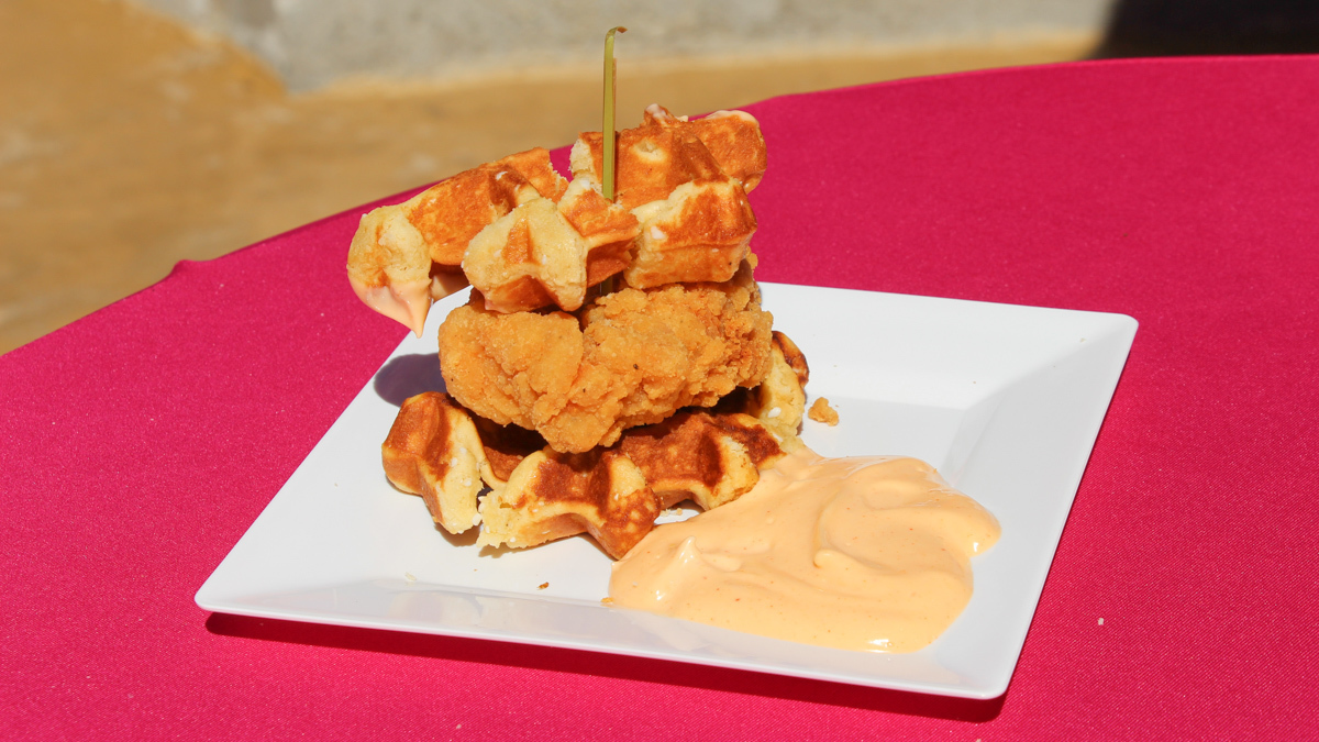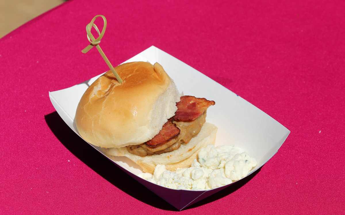 Next we were served a bacon burger slider with bleu cheese crumble and chicken and waffles with sriracha mayo. We really enjoyed both sandwiches. The bleu cheese and sriracha mayo gave them tangy and interesting flavors without overwhelming the other components. According to Chef Paul, chicken and waffles (probably with traditional maple syrup) will be available at the Chicken Shack, when it opens later in the season.
