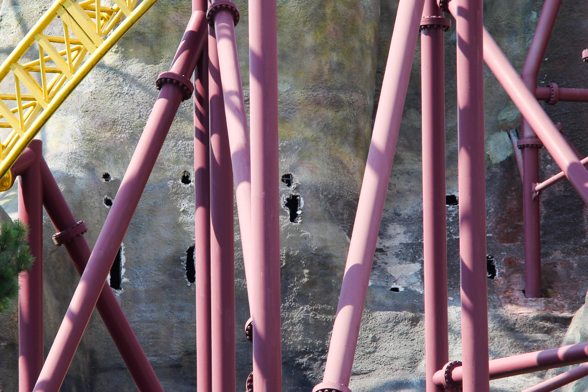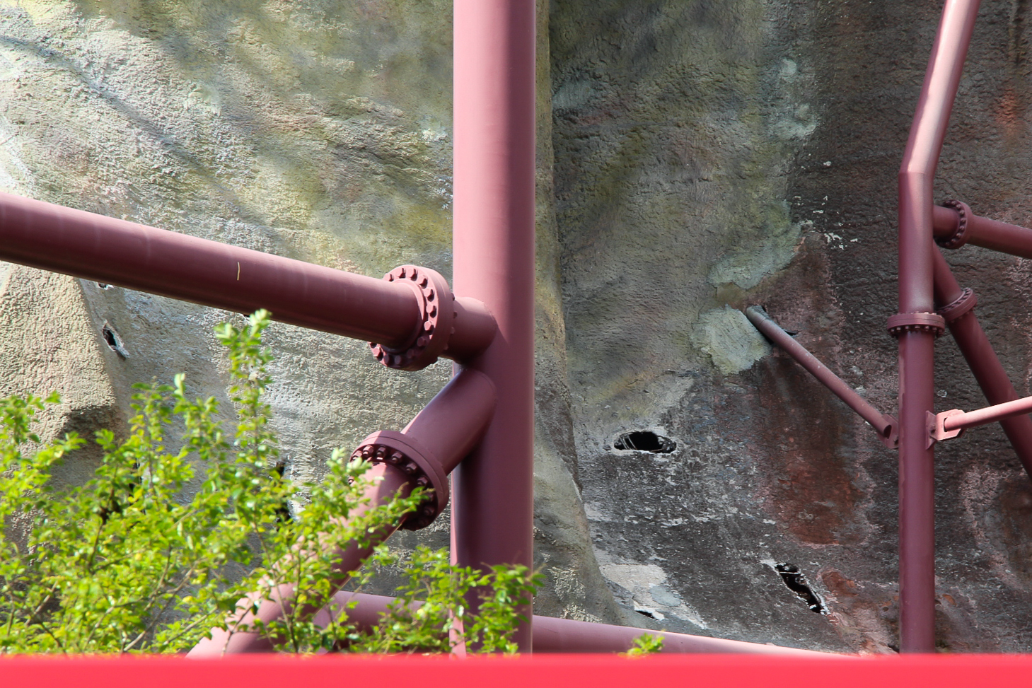 Additionally, Joe of Busch Dominion and I spent some time wandering around Volcano this week and discovered what appear to be some new, very deliberately placed, holes in the mountain around the ride’s vertical launch. This swiss cheese-like effect is clearly visible around both the front and back of the structure—all concentrated towards the center of the attraction. I’ve included a couple images below.