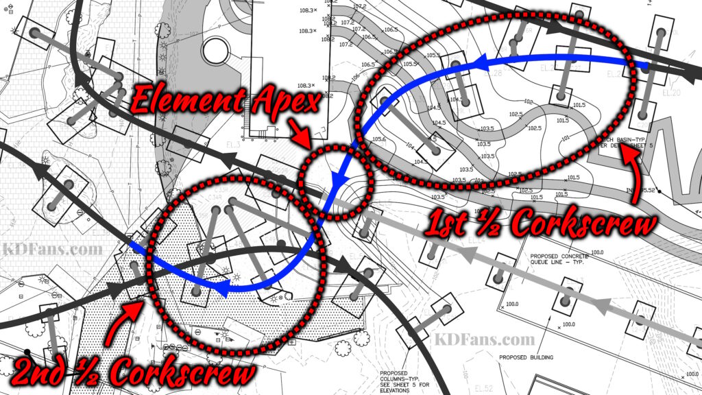 Following the dive out of the horseshoe and under the first corkscrew, we believe the coaster will roll up and to the right into a second corkscrew. Much like the earlier corkscrew, this one also looks somewhat asymmetrical with a notably tighter exit radius than entry radius. Below is an image of ML Design’s mockup of this corkscrew.